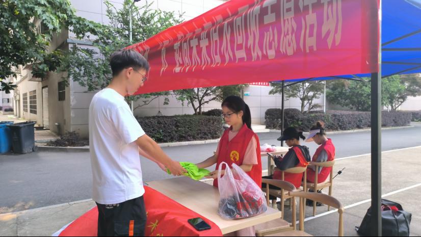 九江职院新闻网讯(电气工程学院 刘奕瑶)为弘扬志愿服务精神,践行节约低碳理念,6月4日,电气工程学院20名志愿者来到十里校区四号宿舍前篮球场,开展“共筑绿色梦,衣起向未来”志愿服务活动。