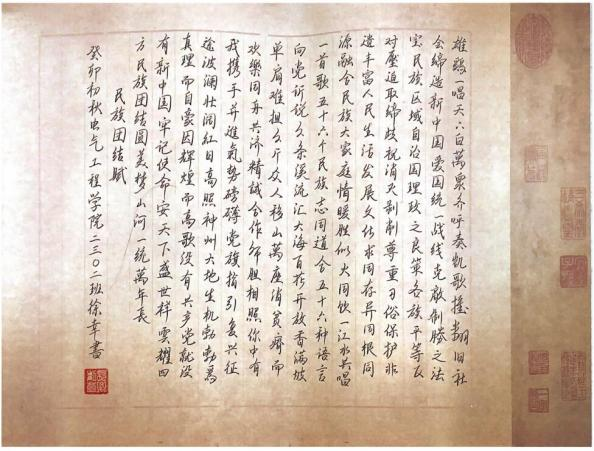 此次活动以“中华民族一家亲,同心共绘石榴红”为主题。各班级积极宣传动员,广大同学们积极响应,共征集书法和绘画作品50余幅,这些书画作品充分展现了同学们对“中华民族一家亲”的认识和理解。经过评审,电气2202班张夏英同学的绘画作品和电气2205班龙芷若的书法作品荣获一等奖,电气2302班徐辛同学和电气2304班张耀洋同学的硬笔书法作品获二等奖,电气2309班李冉同学和信息2301班杜吕昕同学的硬笔作品获三等奖。