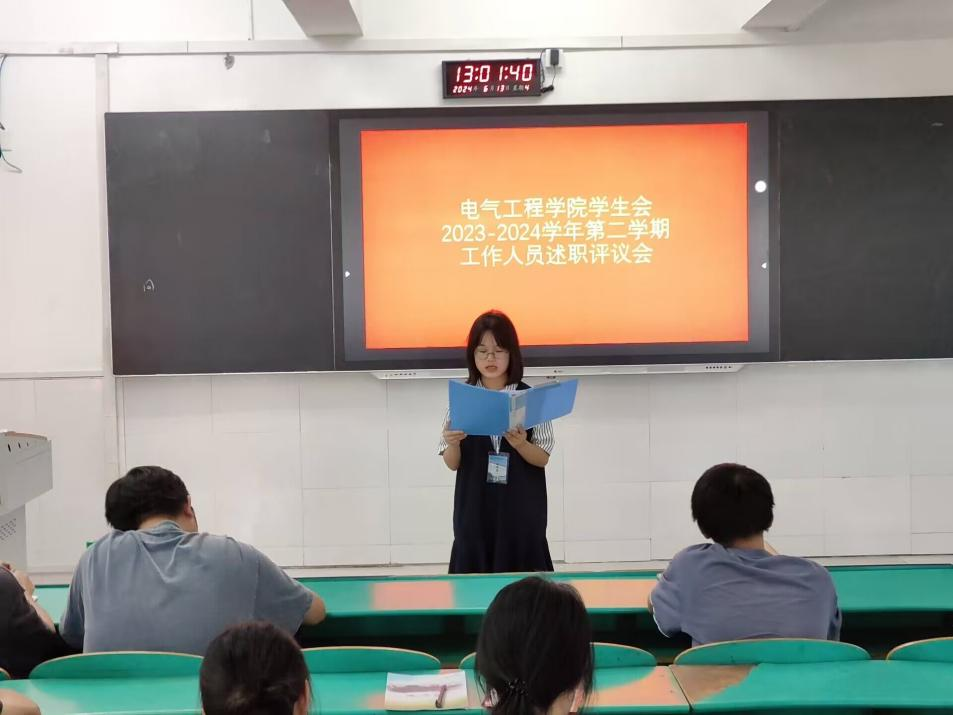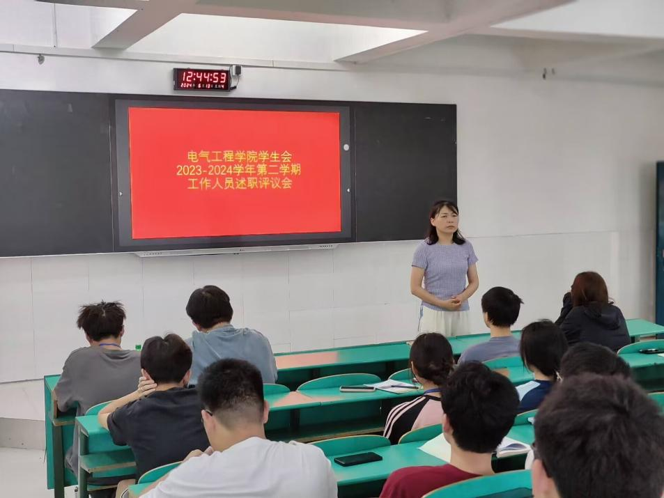 九江职院新闻网讯(电气工程学院 姚俊杰)6月13日12时40分,电气工程学院在十里校区3号教学楼800教室举行学生会2023-2024学年第二学期述职大会,该院学生会秘书长陈艳芬老师及全体学生会成员参加。