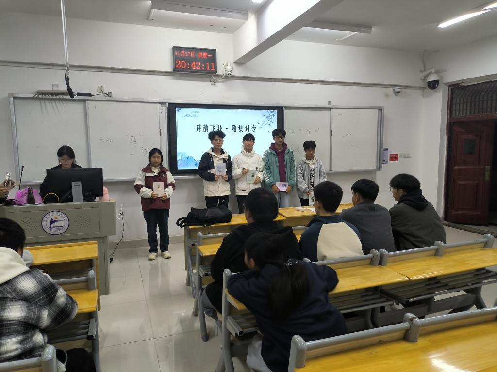 本网讯(电气工程学院)11月17日晚19点30分,晖虹学生文学社于在濂溪校区科创楼A411举办了以“诗韵飞花·雅集对令”为主题的飞花令活动,全体社团成员参与。