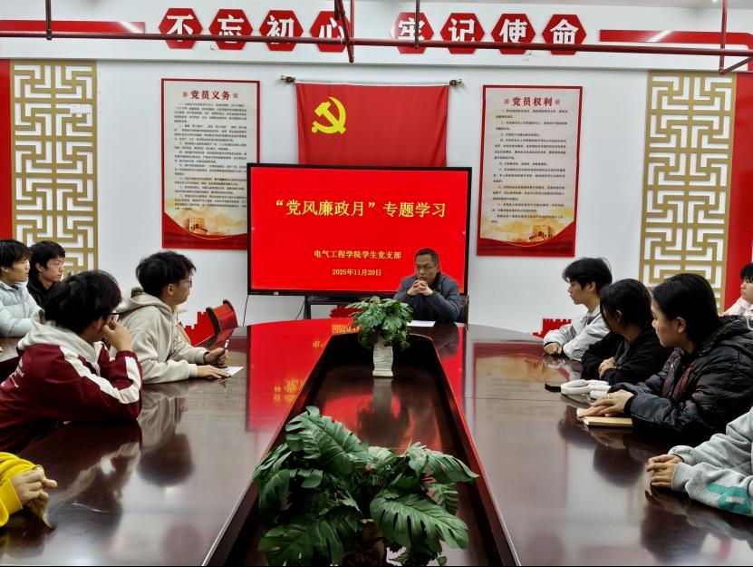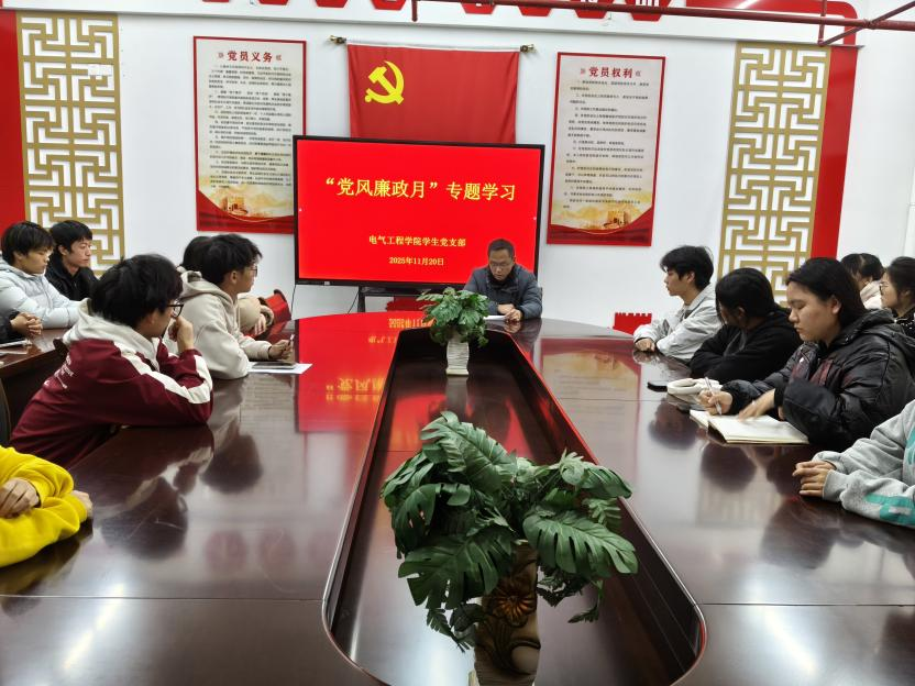 本网讯(电气工程学院 黄菲)2025年11月20晚七点半为贯彻2025年党风廉政要求,电气工程学院学生党支部在十里校区三号教学楼811组织开展了“党风廉政月”专题学习活动,参会人员为该支部全体入党积极分子